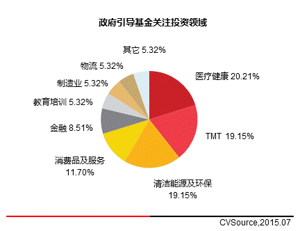 在投資領(lǐng)域方面,我國(guó)政府引導(dǎo)基金對(duì)醫(yī)療健康、TMT和清潔能源及環(huán)保的關(guān)注度最高,占比例分別為20%、19%和19%。