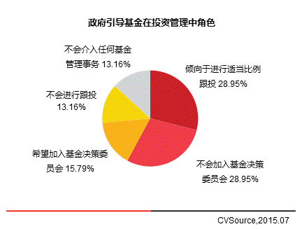 對(duì)于政府引導(dǎo)基金在投資管理中的角色,引導(dǎo)基金的管理機(jī)構(gòu)中約有30%傾向于適當(dāng)比例跟投,30%認(rèn)為引導(dǎo)基金不應(yīng)該加入子基金的投委會(huì)干預(yù)子基金商業(yè)價(jià)值的決策,但可以擁有1票否決權(quán)在是否違背引導(dǎo)基金的設(shè)立初衷上;僅有15%的引導(dǎo)基金還是希望加入子基金的投資決策委員會(huì)。