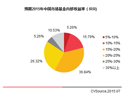 對(duì)2015年中國(guó)VC/PE市場(chǎng)基金內(nèi)部收益率(IRR)預(yù)期上,近40%的引導(dǎo)基金預(yù)期今年國(guó)內(nèi)基金的收益普遍在15%-20%,約30%的引導(dǎo)基金認(rèn)為2015年的基金預(yù)期收益在20%-25%,對(duì)股權(quán)市場(chǎng)的預(yù)期整體較好。