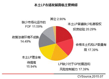 引導(dǎo)基金作為國(guó)內(nèi)人民幣基金的重要LP,其對(duì)本土LP市場(chǎng)發(fā)展普遍認(rèn)為:缺少私募股權(quán)投資經(jīng)驗(yàn)、合格本土機(jī)構(gòu)LP數(shù)量有限、LP缺少對(duì)于GP的甄選和風(fēng)控能力,這三項(xiàng)是其面臨的主要障礙,投中集團(tuán)的2014年度政府引導(dǎo)基金調(diào)研結(jié)果顯示,這三項(xiàng)的權(quán)重累計(jì)占比高達(dá)55%。